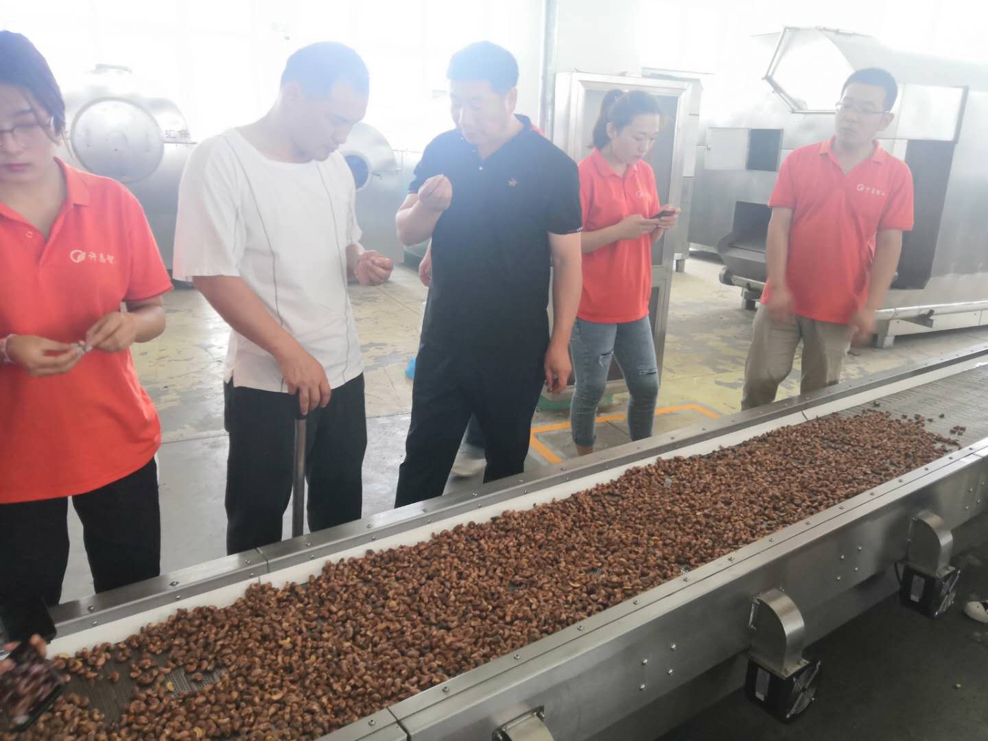 6月19日,山东客户自带腰果到许昌智工试机6米流水线电磁炒货机。