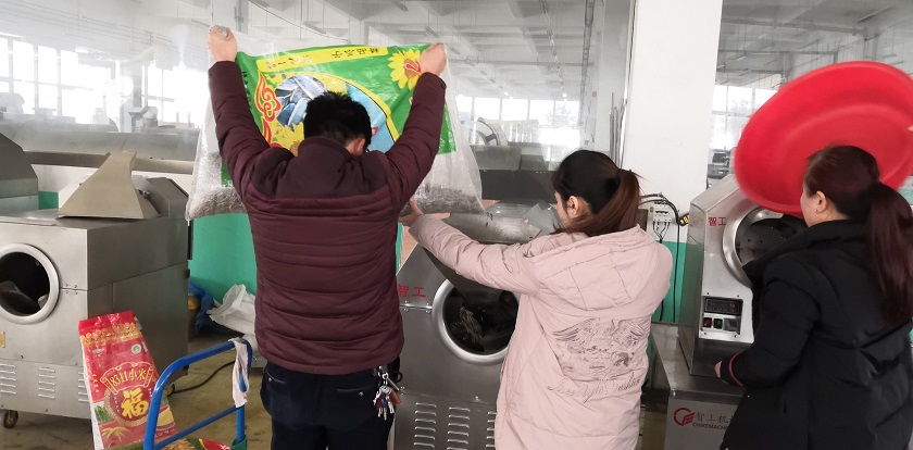 今日(2018-12-29),湖北随州客户来厂试机dccz5-10花生炒货机,分别使用该机炒制一锅原味瓜子和小日本花生果,对于炒制效果非常满意! 经过测试一锅装瓜子35斤,用时15分钟,温度设定155度,用4挡加热;炒花生果45斤,用时55分钟,温度设定150度,用1当加热,实验结果达到客户满意,池老板当场签订合同订机一台,感谢您的信任与支持!预祝生意兴隆!合作愉快! 客户来厂考察多功能炒货机并订购实拍图