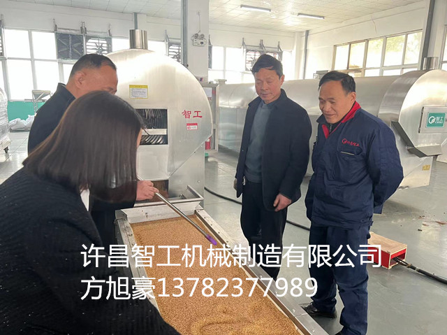 2月17日,河南郑州客户带500斤亚麻籽来厂试机电磁流水线炒制。 许昌智工八米电磁流水线一小时可炒制亚麻籽2000斤,产能高效果好,节能又环保。